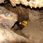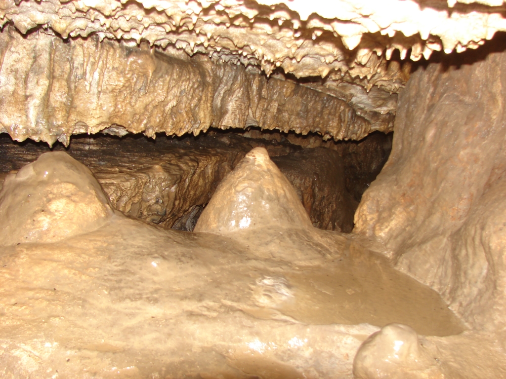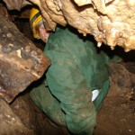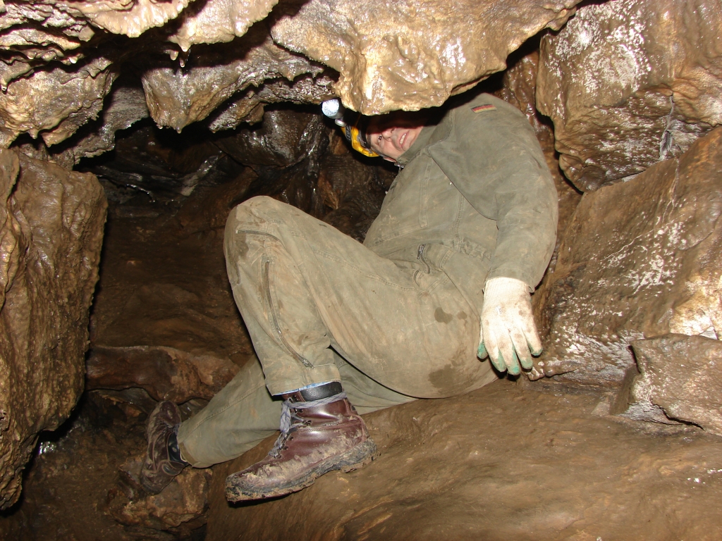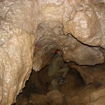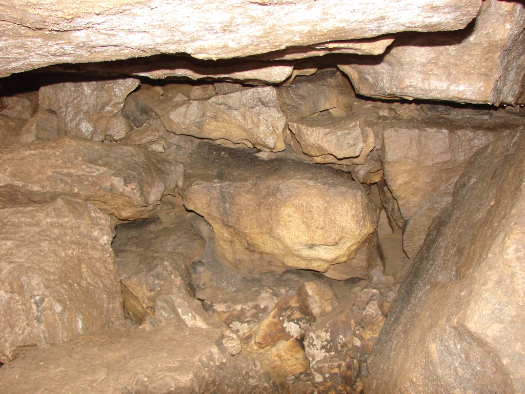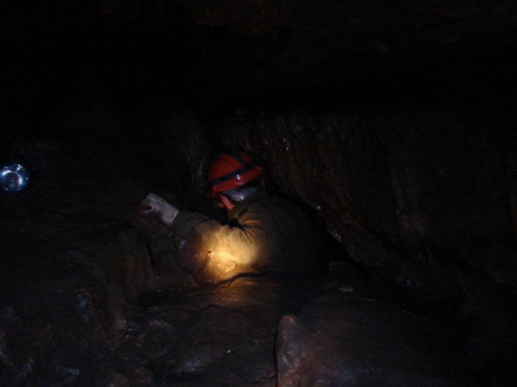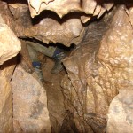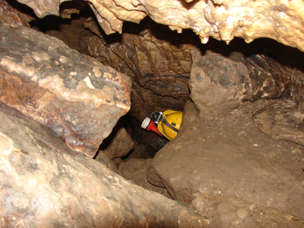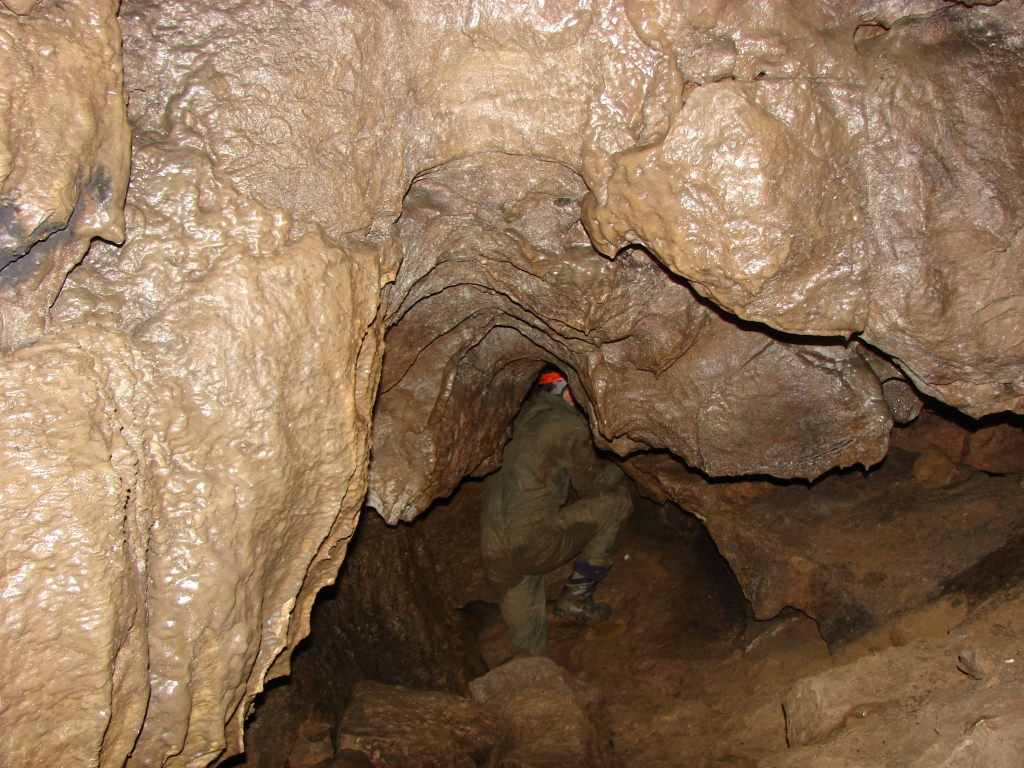 Do kolejnych sal dostajemy się wąskim korytarzem. Przeciskamy się 2÷3 m dość niskim tunelem, aby dotrzeć do komory, w której jaskinia się rozgałęzia. Możemy zejść studnią do dolnych partii jaskini lub wspiąć się ku jej górnym partiom. Podczas wchodzenia do górnej części, należy zachować szczególną ostrożność. W jaskini panuje duża wilgotność, a zatem powierzchnie są dość śliskie, dodatkowo miejsca na wykonywanie manewrów nie jest za wiele. Wchodząc na górę przeciskamy się przez kolejne zwężenie i trafiamy do głównej komory o bogatej, nie zdewastowanej polewie kalcytowej, z której w niektórych miejscach utworzyły się stalagnaty bądź średniej wielkości stalagmity i stalaktyty. Niektóre nacieki o powierzchni mocno pofałdowanej, przypominają zatrzymaną w czasie kaskadę płynącego gęstego płynu. Z tej komory odchodzi parę drobnych szczelin. Po prawej stronie od wejścia na górny poziom znajduje się druga komora z poziomą szczeliną (około 20 cm), pomiędzy stropem, a płytą skalną wytworzyły się dość grube kolumny naciekowe. Wracamy schodzimy w dół, do rozwidlenia, a następnie dalej w dół studni. Opuszczamy się do niej rozpierając się rękoma i nogami. Na dole po lewej stronie znajduję się ślepa odnoga, po prawej stronie tunel schodzi w dół tworząc dość wąską szczelinę. Przejście jest dość ciężkie i wymaga spokojnego, przemyślanego poruszania się. W końcowej fazie pokonywania zacisku musimy opuścić się na półkę niewidoczną z góry. Tutaj zaczyna się mała komora, z której po lewej stronie odchodzi korytarz. Idziemy nim. W spągu po lewej stronie istnieje dość pokaźna szczelina o głębokości około 1m. Można iść nią lub przemieścić się prawą stroną tunelu. Główny tunel wkrótce staje się coraz niższy i wymusza czołganie się. W tym momencie przydaje się posiadanie jednoczęściowego kombinezonu chroniącego przed mokrym, przypominającym błoto, namuliskiem. Po paru metrach tunel zakręca o ponad 90° w prawo. Wychylam się, aby sprawdzić czy jest możliwa dalsza eksploracja. Nie jestem tego pewny, rezygnuję ponieważ ten zakręt jest dość nieprzyjemny, a nie wiadomo czy po kilku metrach dalsza penetracja będzie możliwa.. Powoli wychodzimy przeciskając się szczelinami, wiemy gdzie trzeba się skulić, gdzie najlepiej stawiać stopy, więc jest trochę łatwiej, ale trzeba się lekko wspinać przez co w niektórych miejscach się blokujemy, na spokojnie poprawiamy pozycję i dalej podążamy do wyjścia.