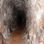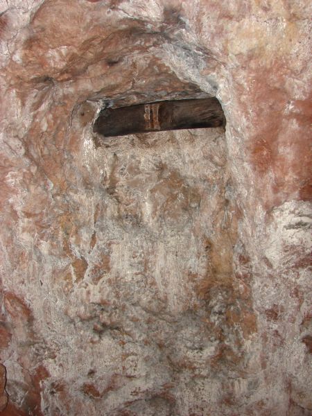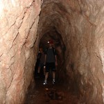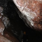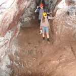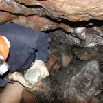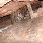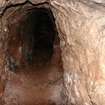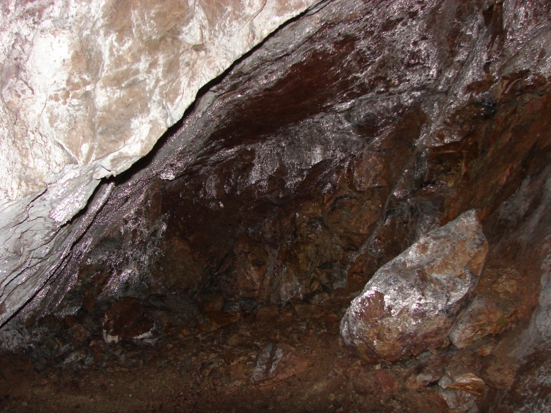 Wracamy do ciągu głównego, do odejścia dwu bocznych korytarzy. Stąd idziemy szerokim korytarzem, którego prawą ścianę tworzy pochylnia zasłana blokami skalnymi. Dalej z prawej strony natrafiamy na chodnik górniczy o długości 8 m. Jeszcze dalej korytarz zwęża się i doprowadza do niewielkiego zawału skalnego podstemplowanego starymi drewnianymi belkami. Tuż za zawałem, po prawej stronie, do ciągu głównego dochodzą wcześniej opisane korytarze. Podążamy dalej opadającym korytarzem rozwiniętym na szczelinie. Docieramy do bocznego chodnika, odchodzącego w prawo, zalanego już na wstępie wodą.